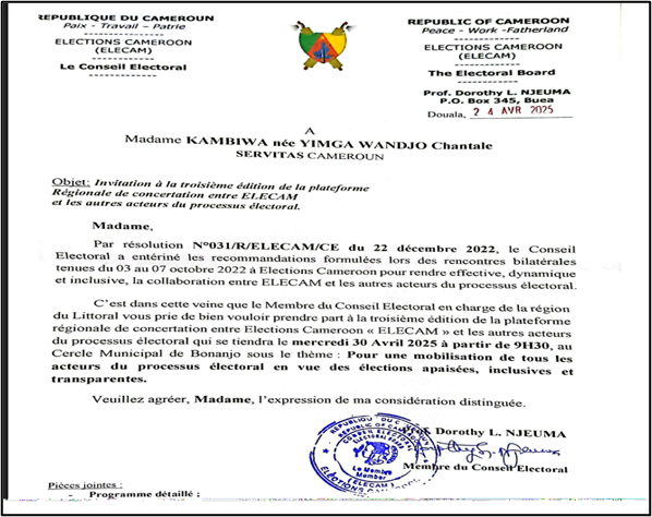 SERVITAS Cameroon a participé à la troisième édition de la plateforme régionale de concertation entre ELECAM et les autres acteurs du processus électoral qui s’est tenue le 30 Avril 2025 au Cercle Municipal de Bonanjo (Douala), sous le thème « pour une mobilisation de tous les acteurs du processus électoral en vue des élections apaisées, inclusives et transparentes. », organisée par le Membre du Conseil Electoral en charge de la plateforme.
